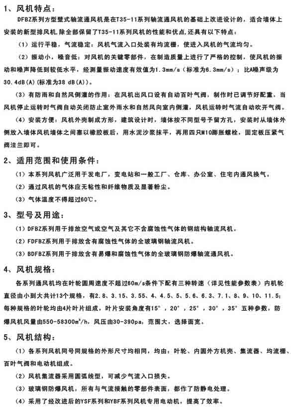 1、HTF型消防高溫排煙風機 2、HTF(PYSWF)型高溫排煙混流風機 3、HTFC消防通風兩用柜式離心風機 二、混流通風機系列 1、SWF(HLF)型混流通風機 2、SWF-IV(HL3-2A)型低噪聲節能混流通風機 3、SWF-V(SJG)型斜流(混流)通風機 4、HLF-6型低噪聲節能混流風機箱 三、低噪聲軸流通風機系列 1、T35-11(T40-11)型軸流通風機 2、DZ型低噪聲軸流通風機 3、DFBZ型壁式軸流通風機 4、SDF型隧道式軸流通風機 5、DWEX系列邊墻風機 四、屋頂通風機系列 1、DWT-I型軸流式屋頂風機 2、DWT-II(III)型離心式屋頂風機 3、DWT-IV型無動力屋頂風機 4、RTC低噪聲離心式鋁制屋頂風機 |
